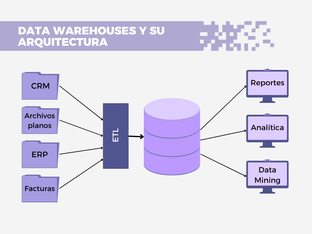 Un Data Warehouse posee una estructura definida y utilizada de una forma similar en todos los lugares o empresas donde se utiliza. A esto se le llama la arquitectura de un Data Warehouse. En general, esta arquitectura sigue un enfoque de tres capas: