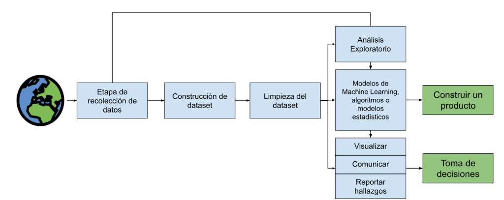 Al igual que todas las ciencias, la ciencia de datos sigue un proceso meticuloso y sistematizado, lo que permite que los resultados sean replicables y demostrables. Este proceso cuenta con etapas bien definidas que ayudan a ordenar el análisis según la pregunta o hipótesis que se desea abordar. Este proceso puede ser resumido en la siguiente figura.